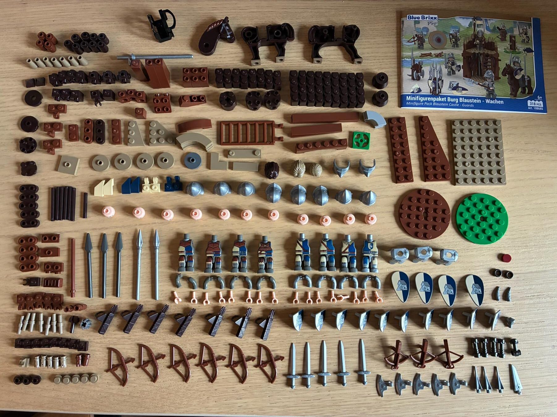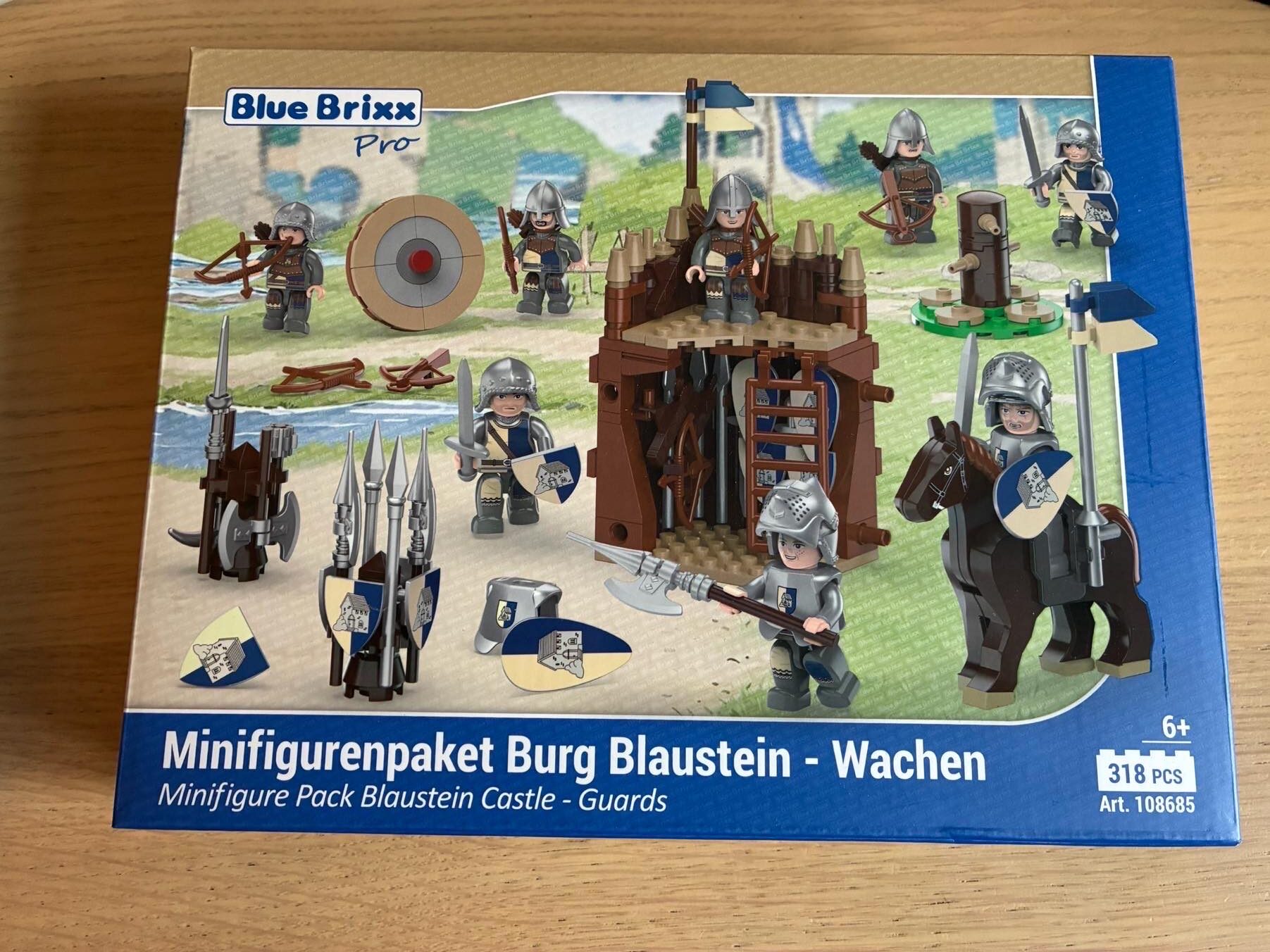 Seit kurzem gibt es für Burg Blaustein Minifiguren. Während die Herrschaften schon die Burg besiedeln, fehlte bisher noch eine erfahrene Wachmannschaft. Das Set „Wachen“ besteht aus acht Figuren mit passender Ausrüstung. Außerdem ist eine kleine Palisadenecke mit Waffenlager vorhanden.